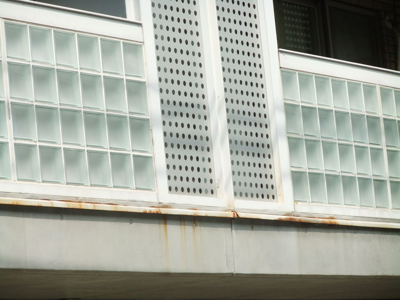 この部分を改修するためには、水切り上部のガラスブロックを一時的に取り外すか、鉄でできた水切りをウレタンのような材料で覆ってしまう必要があります。